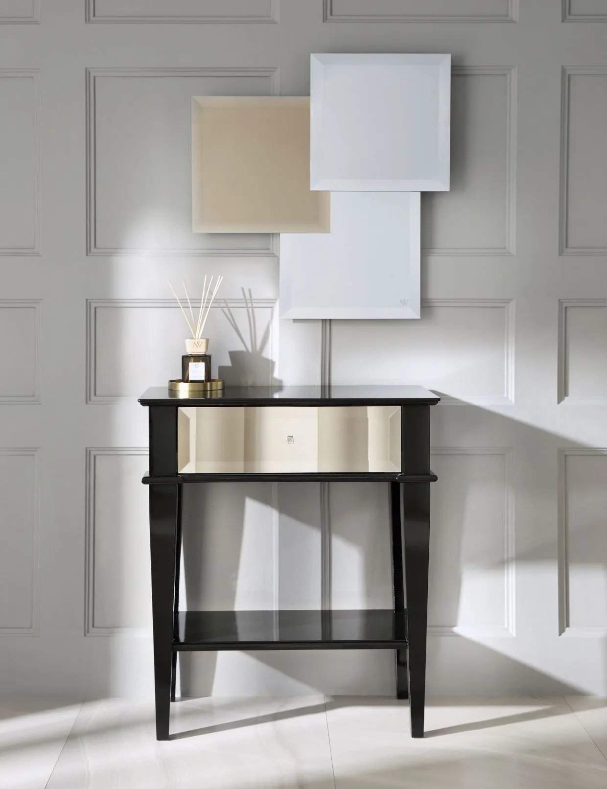 Konsola Elia to kwintesencja elegancji w stylu New Look. Niewielki, 1-szufladowy korpus wsparty jest na smukłych nóżkach. Wykończenie w klasycznej czerni – uszlachetnionej wysokim połyskiem – pięknie kontrastuje z bursztynowo – złotym, lustrzanym frontem. Praktyczna szuflada oraz dolna półka, zapewnią dodatkową przestrzeń do przechowywania. Ta niewielka konsola jest meblem uniwersalnym. Doskonale sprawdzi się zwłaszcza we wnętrzach o ograniczonej przestrzeni lub jako uzupełnienie głównej aranżacji – idealna ozdoba ściany, pomocnik w salonie, przedpokoju lub sypialni.
