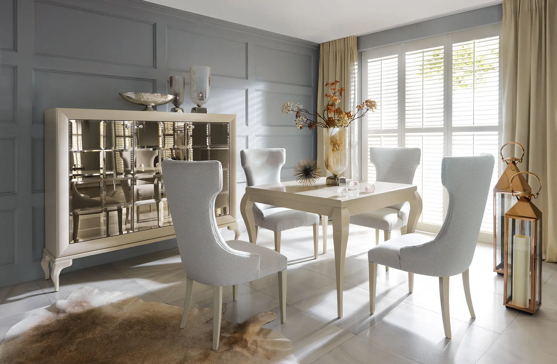 Stół Tulio to prostota w klasyce. Blat sporych rozmiarów tworzy miejsce idealne do spotkań z rodziną i znajomymi, a smukłe, delikatnie wygięte nóżki dodają całości lekkości i szyku.