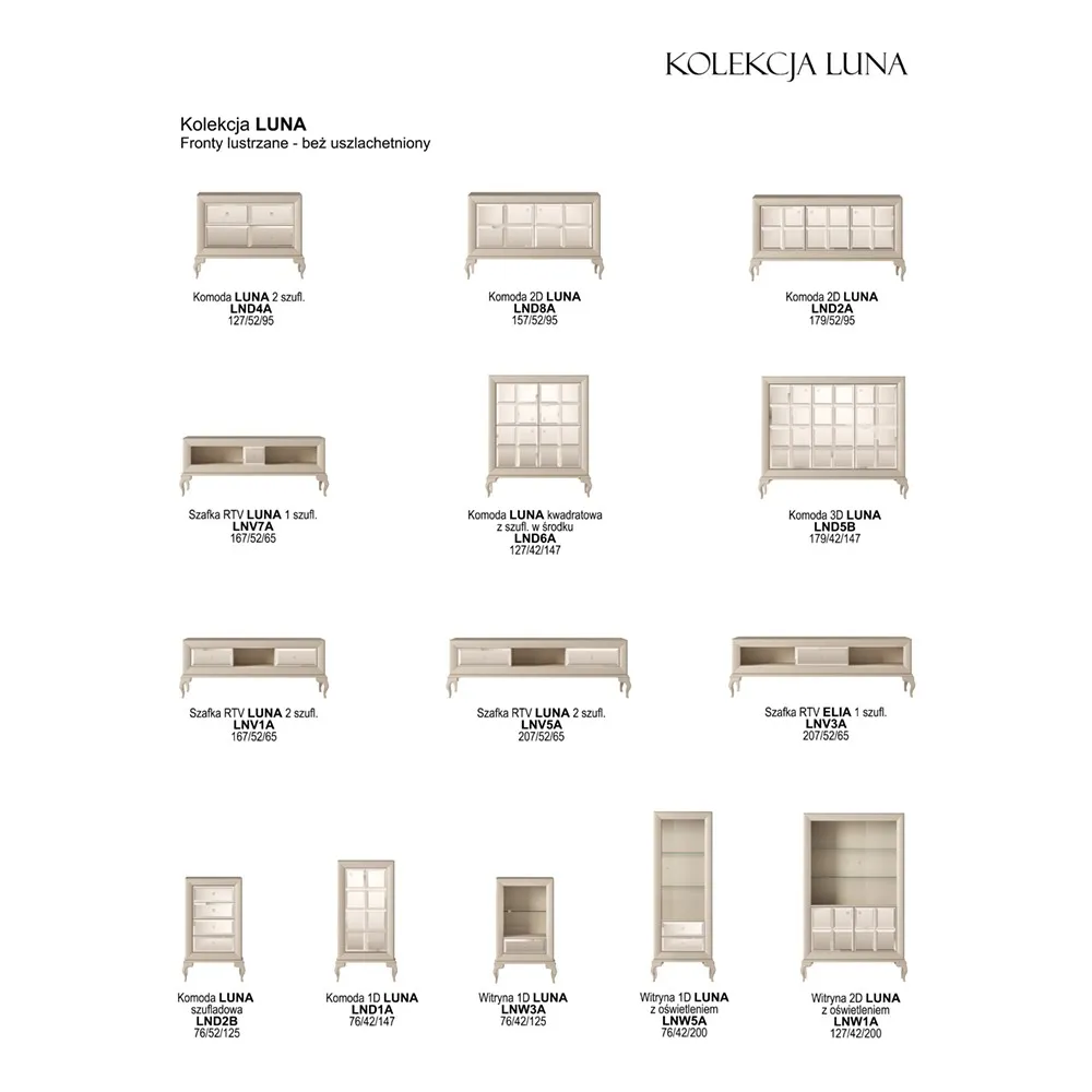 Luna to szlachetna linia mebli klasycznych, w nowej ekskluzywnej formie. Charakterystyczne, subtelnie gięte nóżki to niekwestionowany znak rozpoznawczy całej kolekcji. Beżowe wybarwienie, fazowane lustra na frontach, kryształowe uchwyty – to wszystko sprawia, że mebel zachowuje subtelny, kobiecy charakter. Idealnie sprawdzi się we wnętrzach o wyrafinowanym, eleganckim wystroju.