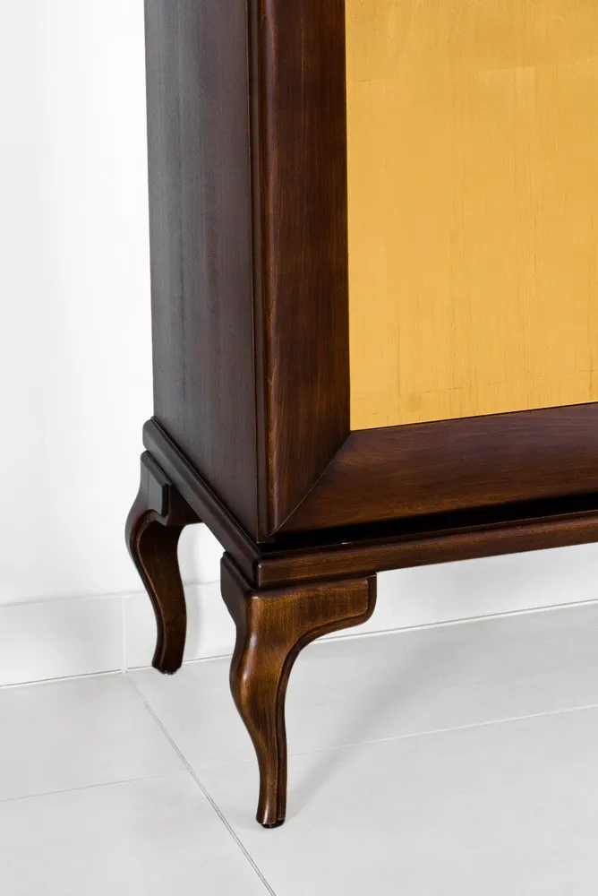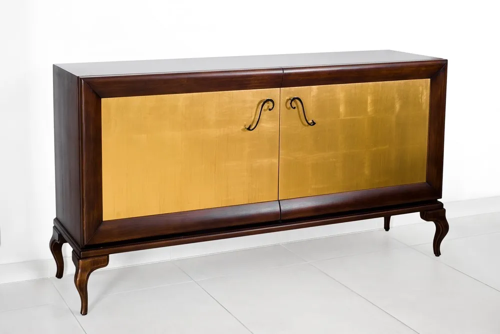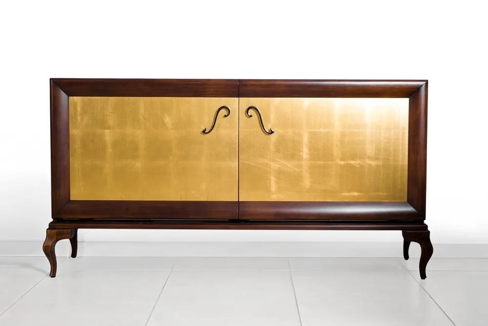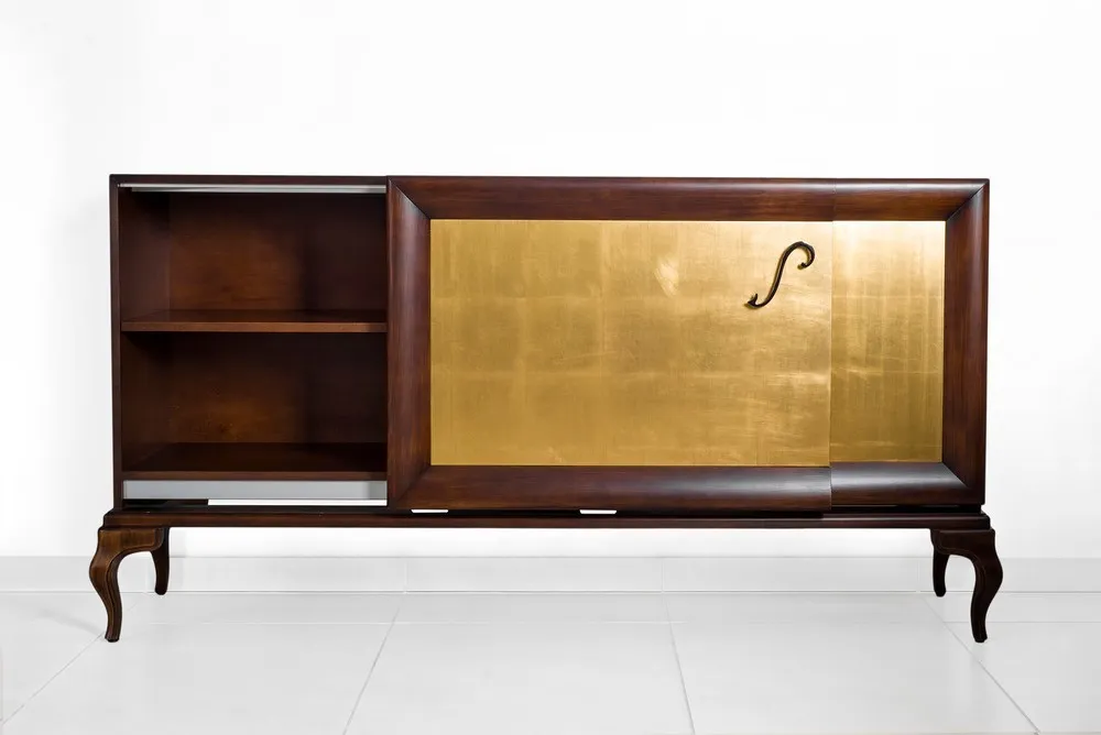 Komoda LUNA z drzwiami przesuwanymi i frontami wyklejonymi złotym szlagmetalem to połączenie nowoczesności i klasy nawiązujące do światowych trendów wzornictwa. Klasyczny mebel we współczesnym kostiumie adresowany jest do miłośników wnętrz, którzy poszukują połączenia ponadczasowego szyku i modnej ekstrawagancji. Świetnie sprawdzi się w aranżacji salonu, przedpokoju, a nawet sypialni. Komoda dostępna jest w różnych wersjach rozmiarowych.