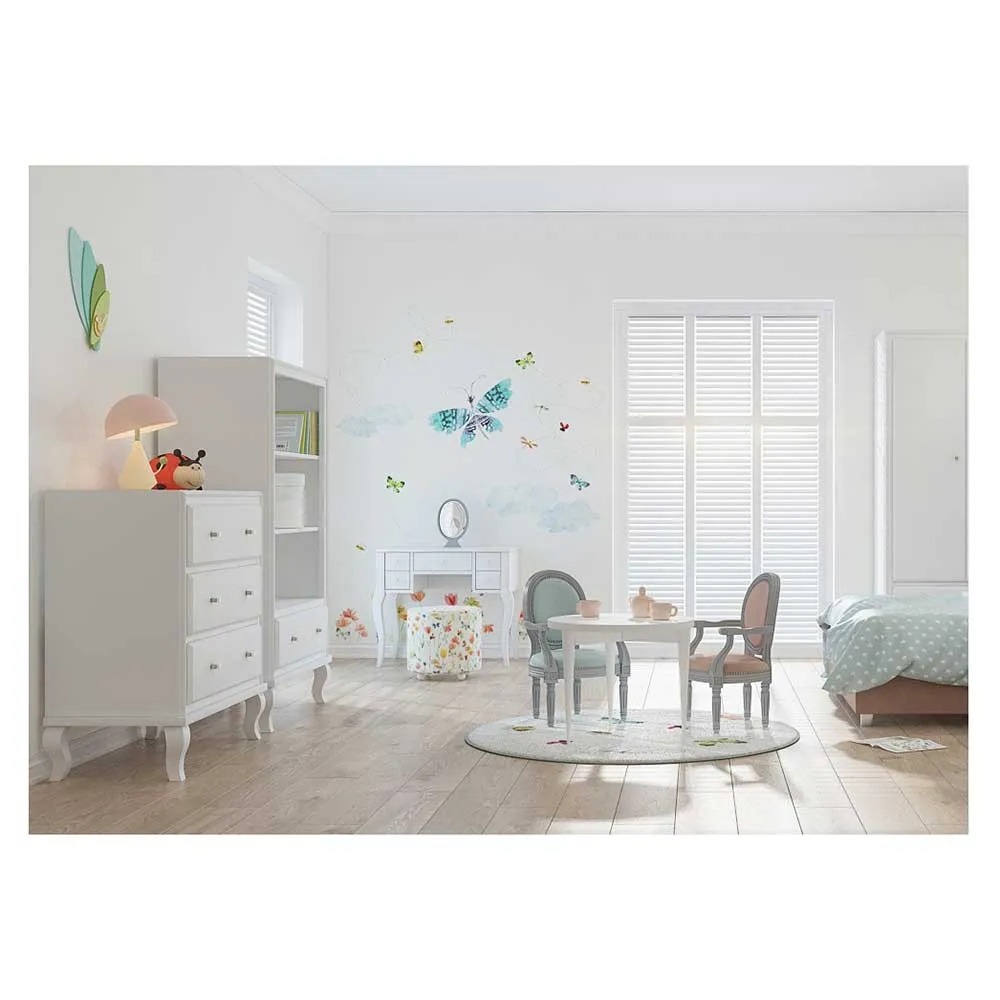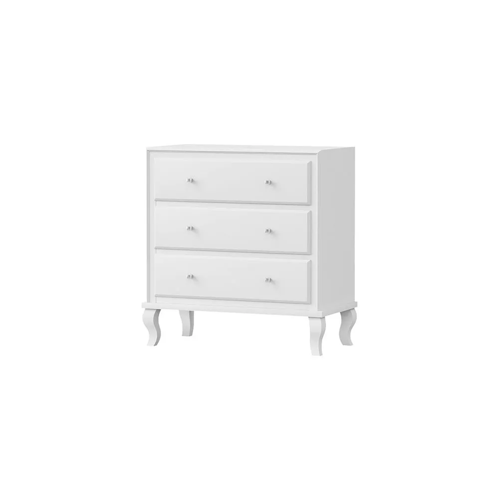 Komoda MUSA to prosta forma z nutą klasyki. Niewielkie wygięte nóżki oraz uchwyty w formie drobnych kryształków nadają uroku i delikatności całej bryle mebla. Komoda jest również meblem funkcjonalnym- trzem pojemnym szufladom otrzymujemy sporą przestrzeń do przechowywania. Stylowa prostota daje zawsze dobry efekt we wnętrzach takich jak salon, sypialnia czy gabinet. Doskonałym uzupełnieniem jest szafa MUSA oraz toaletka MATYLDA, które w komplecie mogą stworzyć niezwykły pokoik małej księżniczki. Komoda dostępna jest również w wersji z frontem lustrzanym.
