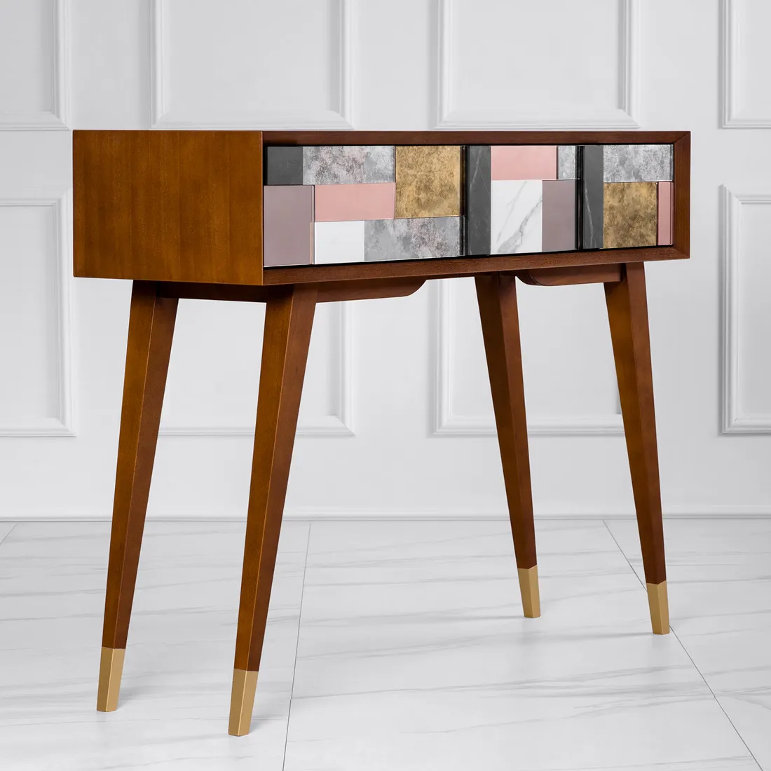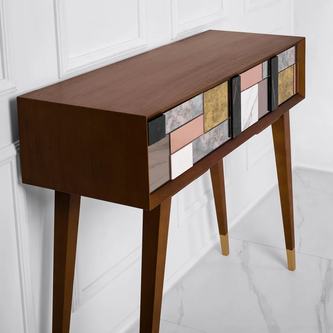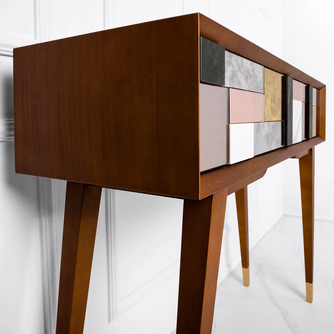 Czy to konsola, czy toaletka? A może biurko? Ten mebel może pełnić wiele funkcji – zależnie od wnętrza, w którym zamieszka. Ale to jego forma uwodzi! Jedna z kultowych opcji to przestrzenna mozaika na froncie – unikatowa kompozycja złożona z luster postarzanych w trzech odcieniach oraz ze spieków kwarcowych. Układ mozaiki jest niepowtarzalny, wynika bowiem z wykorzystania materiałów z recyklingu od polskich producentów wysokiej klasy materiałów. Tak tworzy się design przyszłości!