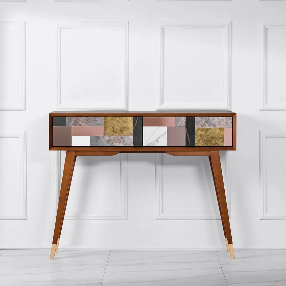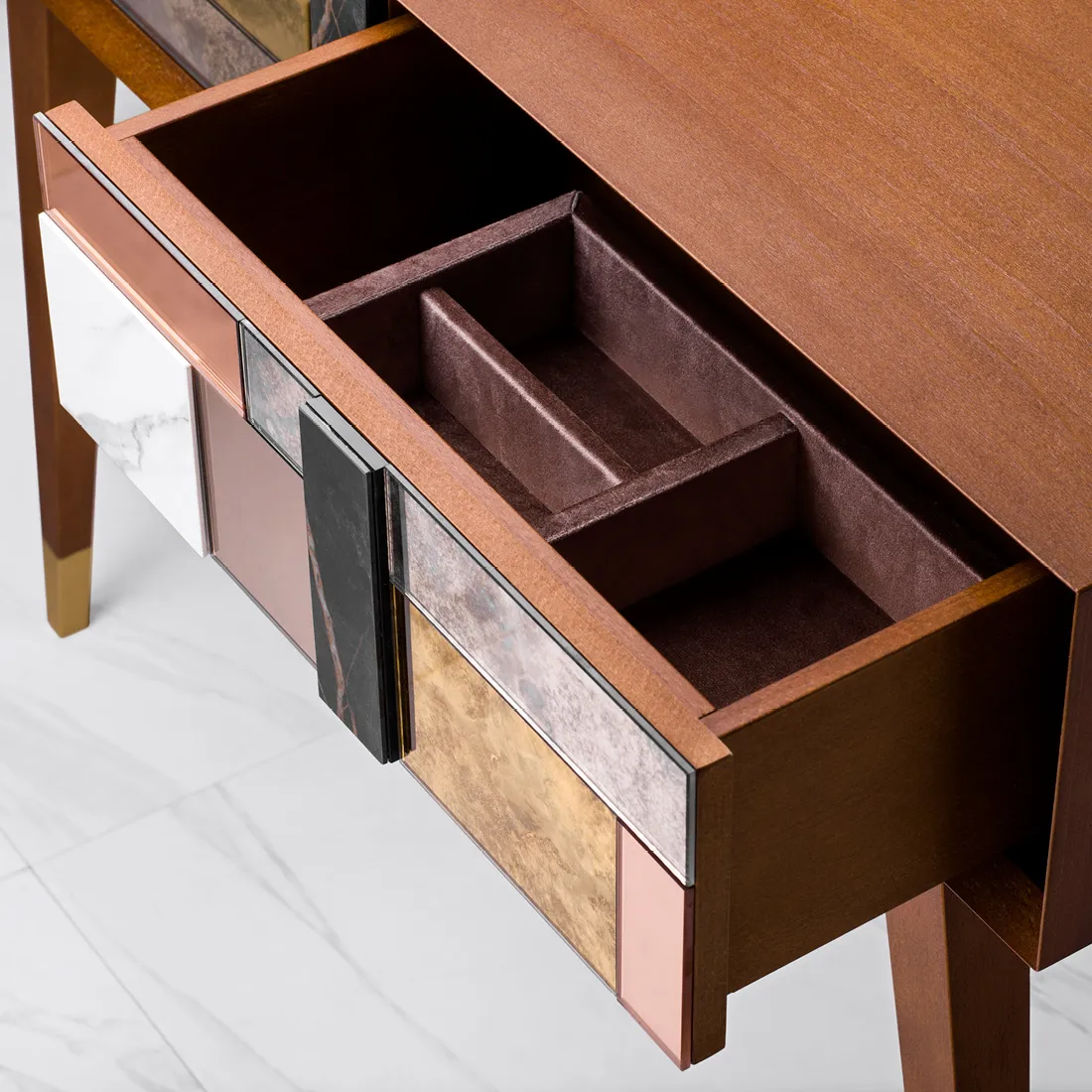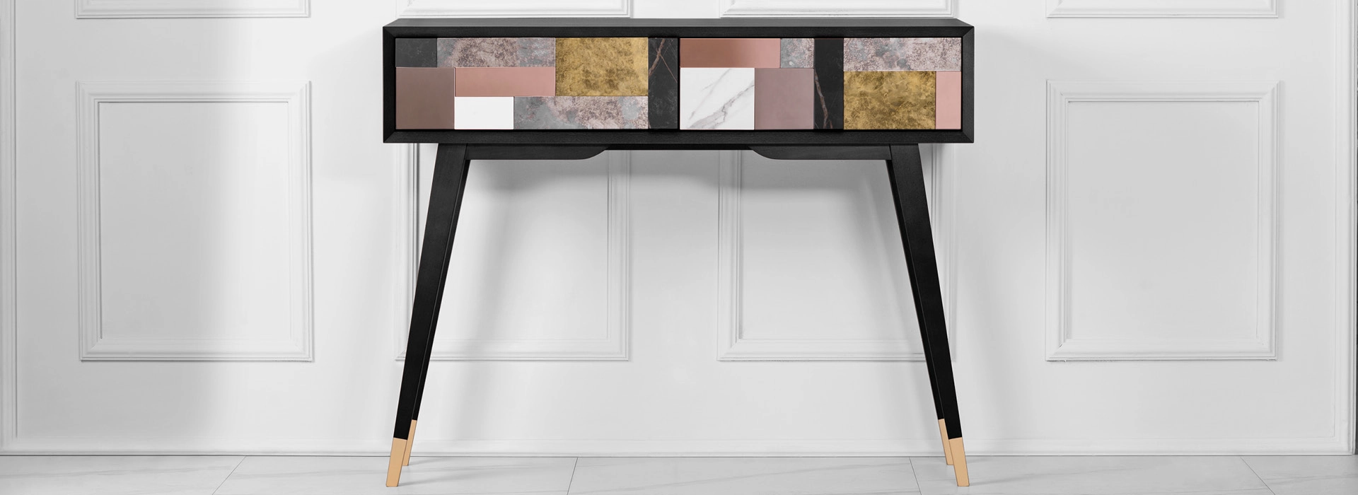 Czy to konsola, czy toaletka? A może biurko? Ten mebel może pełnić wiele funkcji – zależnie od wnętrza, w którym zamieszka. Ale to jego forma uwodzi! Jedna z kultowych opcji to przestrzenna mozaika na froncie – unikatowa kompozycja złożona z luster postarzanych w trzech odcieniach oraz ze spieków kwarcowych. Układ mozaiki jest niepowtarzalny, wynika bowiem z wykorzystania materiałów z recyklingu od polskich producentów wysokiej klasy materiałów. Tak tworzy się design przyszłości!