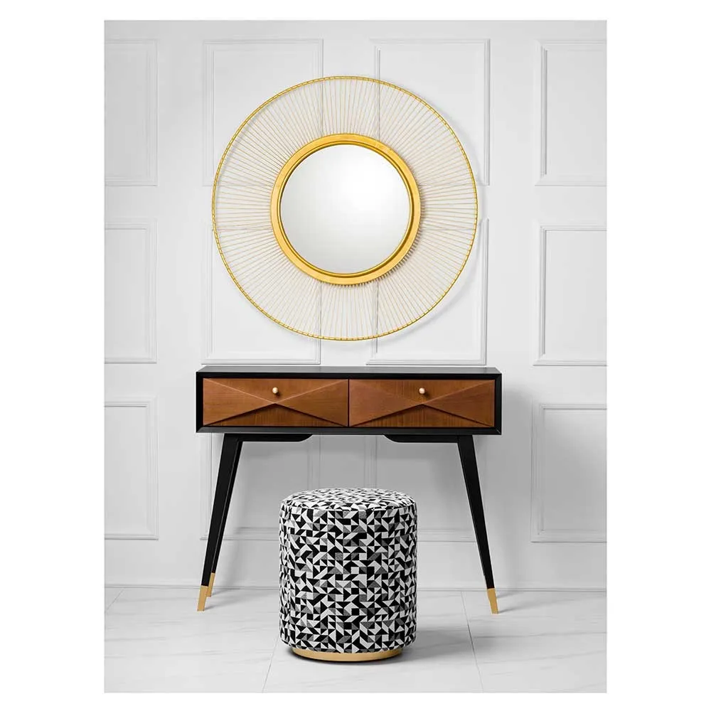Oryginalne lustro ubrane w ciepłą złotą barwę; srebrna tafla lustra zamknięta jest w metalowej dekoracyjnej ramie o nieco pofalowanej powierzchni, widocznej zwłaszcza pod kątem. Lustro przykuwa uwagę i stanowi mocny wnętrzarski akcent.