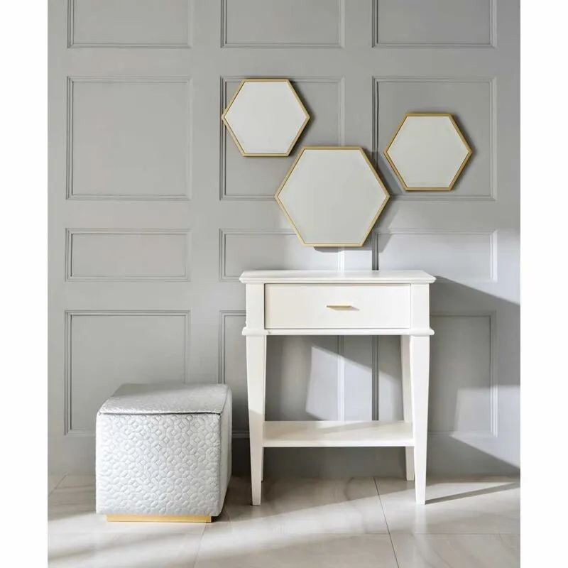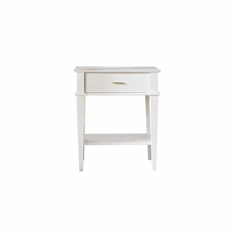 Konsola Elia to kwintesencja elegancji w stylu New Look. Niewielki, 1-szufladowy korpus wsparty jest na smukłych nóżkach. Wykończenie w kolorze perły – autorskim wybarwieniu Novelle – pięknie eksponuje wysokiej klasy, mosiężny uchwyt. Praktyczna szuflada oraz dolna półka, zapewnią dodatkową przestrzeń do przechowywania. Ta niewielka konsola jest meblem uniwersalnym. Doskonale sprawdzi się zwłaszcza we wnętrzach o ograniczonej przestrzeni lub jako uzupełnienie głównej aranżacji – idealna ozdoba ściany, pomocnik w salonie, przedpokoju lub sypialni.