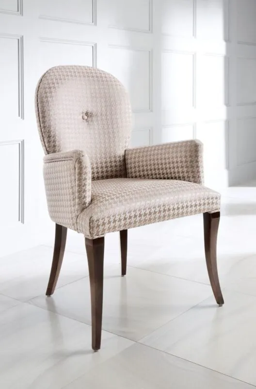 Krzesło Capri to zestawienie wygody i luksusu w jednym. Miękka tkanina w dużą pepitkę została podkreślona pojedynczym pikowaniem z guzikiem. W całości tapicerowanemu siedzisku, podłokietnikom i oparciu lekkości dodają smukłe wygięte nóżki. Zastosowane wybarwienie w kolorze orzecha włoskiego doskonale komponuje się z jasnym kolorem tkaniny. Krzesło sprawdzi się zarówno przy stole jak i jako fotel przy toaletce czy konsoli.