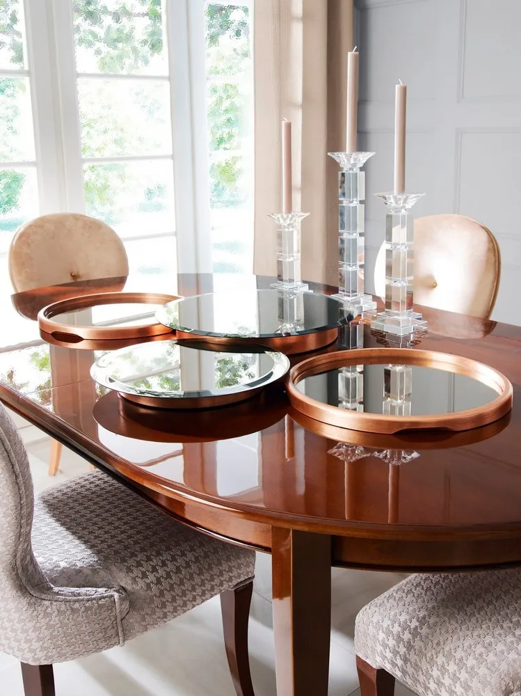 Lustrzaną, srebrną taflę z ozdobnym fazowaniem osadzono na wyklejanej miedzianym szlagmetalem podstawie. Piękna i funkcjonalna, sprawdzi się zarówno jako samodzielna dekoracja stołu lub też w formie eleganckiej patery; idealnie sprawdzi się do wyeksponowania innych, eleganckich drobiazgów.