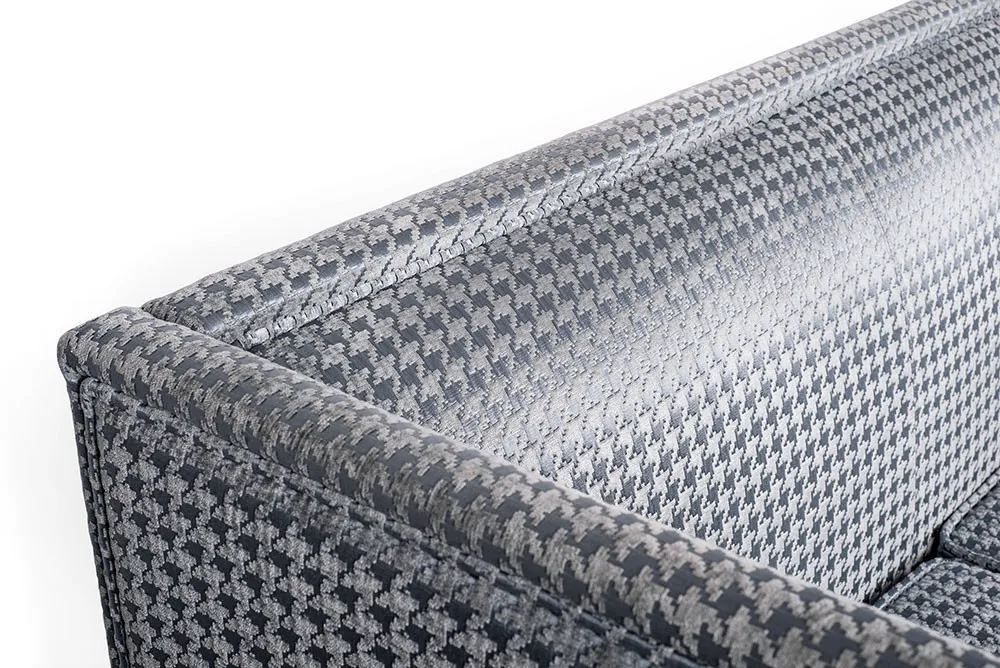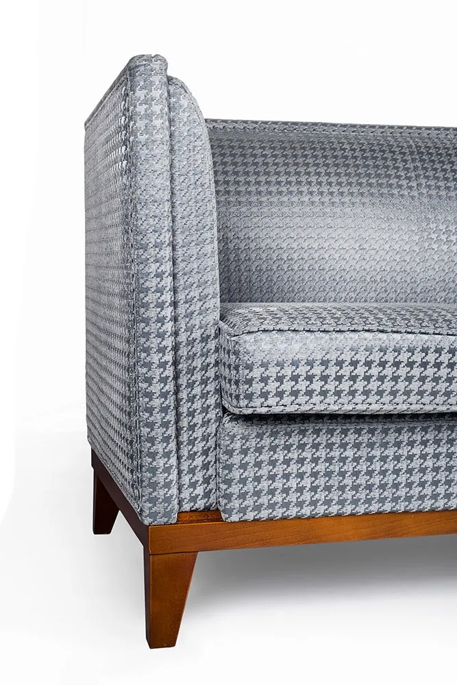 Sofa Iris to połączenie komfortu i niepowtarzalnego charakteru. Głębokie siedzisko daje możliwość relaksu i wypoczynku, a kubistyczna forma z wysokimi podłokietnikami wyróżnia mebel na tle innych modeli. Sofa została ozdobiona tkaniną z dużą pepitką w przyjemnym szarym kolorze. Dostępna jest także sofa Iris 2-os., a nawet fotel, pufa i leżanka.
