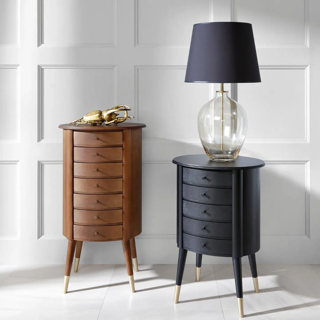 Eklektyczny stolik z piramidą szuflad, zawadiacko łączący dwie estetyki. Cylindryczny korpus z blatem o profilowanej krawędzi to dziedzictwo klasycyzujących mebli stylowych. Ale wtręt z innego świata form dodaje mu nowej energii – to wysokie nogi, skośnie odstawione niczym podpory marsjańskiego lądownika, dowcipny cytat z niesfornych lat 1960. Stoliki z Kolekcji Cylinder, 5- czy nawet 7-szufladowy, to zaufany pomocnik w salonie, przedpokoju czy sypialni. Szeroka gama wybarwień ułatwi udane zestawienia z innymi meblami z kolekcji Novelle (np. Flo czy Gio). Szczególnie polecamy wybarwienia matowe, które podkreślają naturalny rysunek drewna, np. koniak, orzech włoski czy czarna perła. Wysokie nogi wykończone są metaliczną podstawą: złotą lub srebrną.