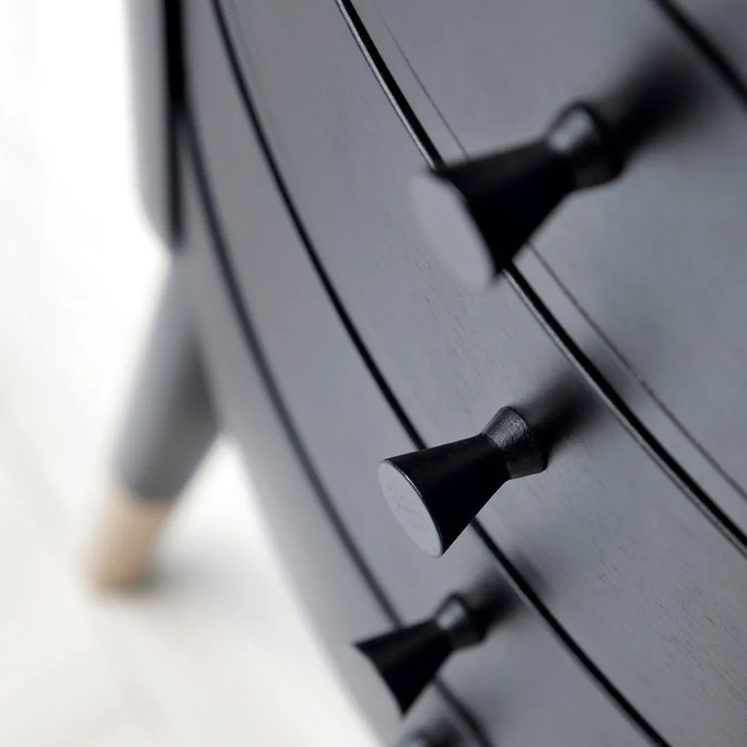 Eklektyczny stolik z piramidą szuflad, zawadiacko łączący dwie estetyki. Cylindryczny korpus z blatem o profilowanej krawędzi to dziedzictwo klasycyzujących mebli stylowych. Ale wtręt z innego świata form dodaje mu nowej energii – to wysokie nogi, skośnie odstawione niczym podpory marsjańskiego lądownika, dowcipny cytat z niesfornych lat 1960. Stoliki z Kolekcji...