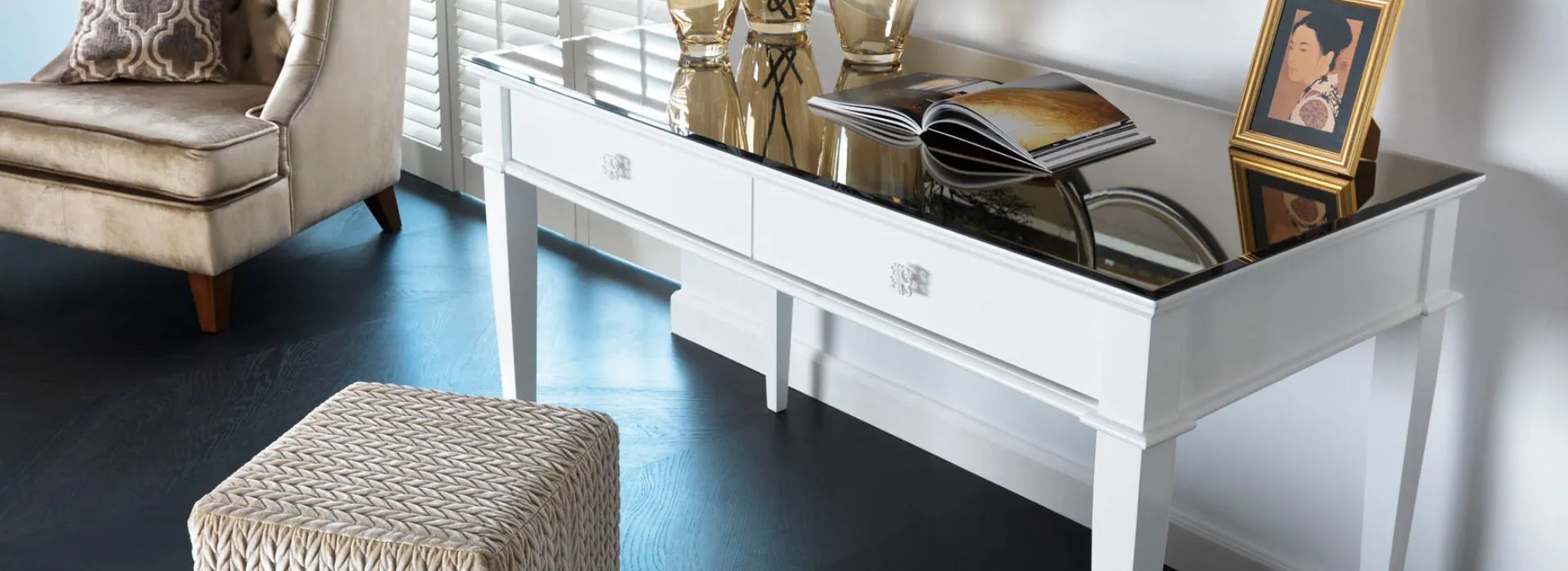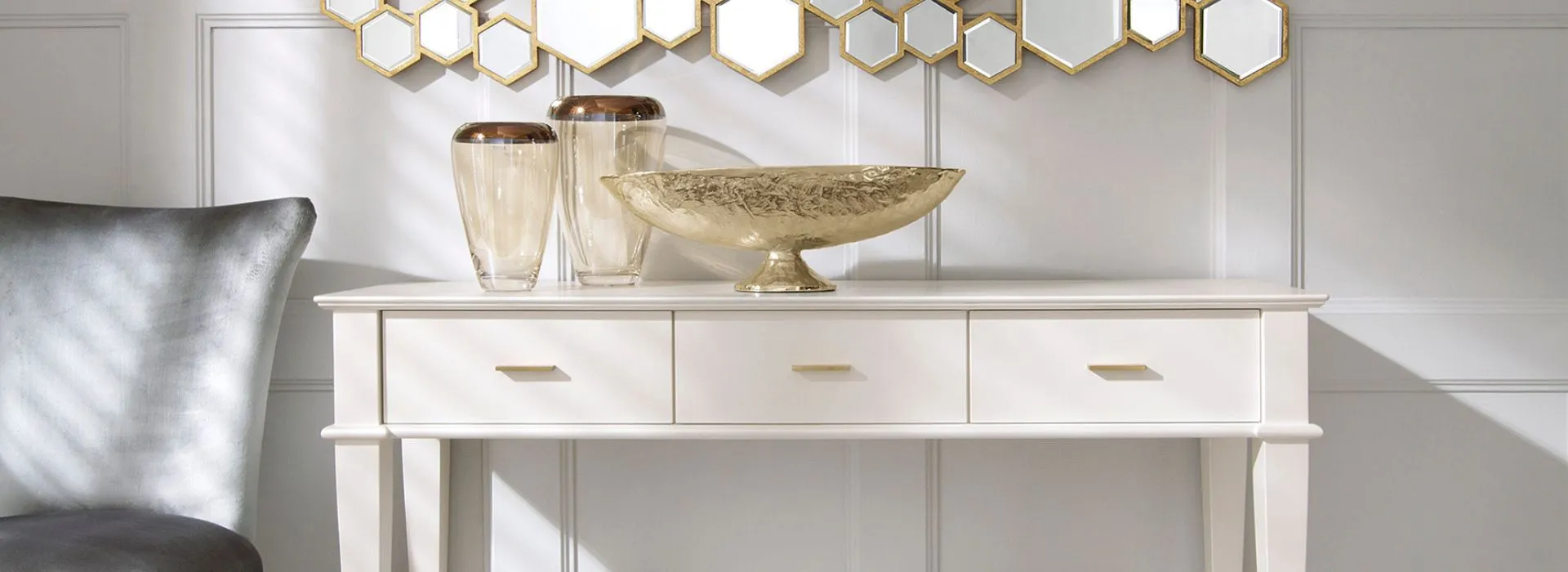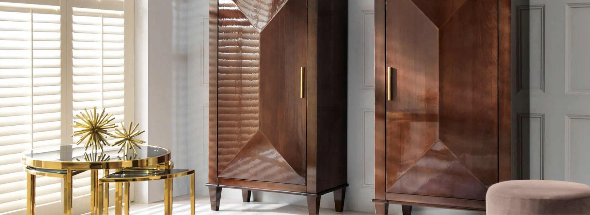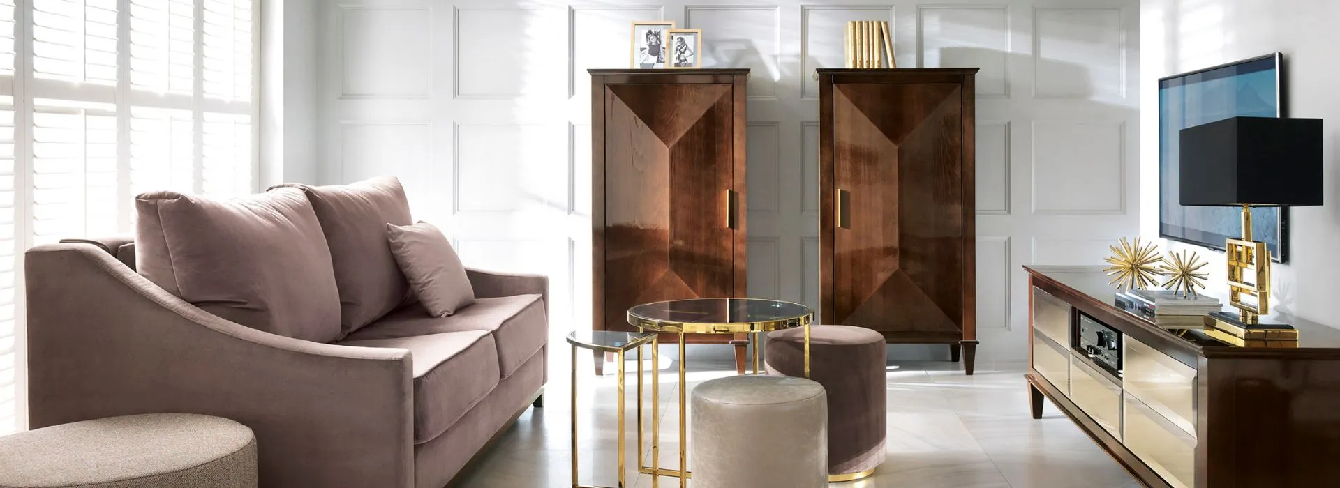 Ta kolekcja to wzorowe przetworzenie klasycznych form mebli stylowych. Ich spokój i dojrzała prostolinijność – są tu zmodernizowane przez wyraziste modyfikacje. Drzwi komód profilowane są światłocieniowo, przybierając kształt szlifowanego diamentu (raut). Lub wykonane z luster, których sfazowane krawędzie dają efekt lśniących, oszlifowanych kryształów, ujętych w ciemny brąz korpusu. Elia to obszerna kolekcja komód, wyższych i niższych (w tym RTV), zamkniętych drzwiami lub szufladami (pojedynczymi lub zwielokrotnionymi; wybór jest bardzo duży, a efekt spektakularny). Są tu też przeszklone witryny, a także mniejsze: stoliki, konsole, toaletki i biurka. Do wyboru są dwa rodzaje frontów. Profilowane na kształt szlifowanego diamentu (raut) i barwione na kolor korpusu. Lub wykonane z luster, srebrnych czy brązowych; ich sfazowane krawędzie tworzą gęsty, regularny rytm powtórzeń. W mniejszych meblach (komody RTV, konsole, toaletki) fronty szuflad są płaskie, w kolorze korpusu, ale mogą też być wykonane z lustra. Połączenie estetyki klasycznej z nowoczesną ułatwi zestawienia mebli Elia z innymi z kolekcji Novelle, czy to zaawansowanymi stylowo, czy nowocześnie. Wysokie nóżki stolików, konsol czy toaletek mogą być jednolite kolorystycznie albo wykończone metaliczną podstawą (złoto, srebro). Zaś plecy witryn wykonuje się w kolorze korpusu lub też bardziej ekskluzywnie, w lustrze: srebrnym czy brązowym.