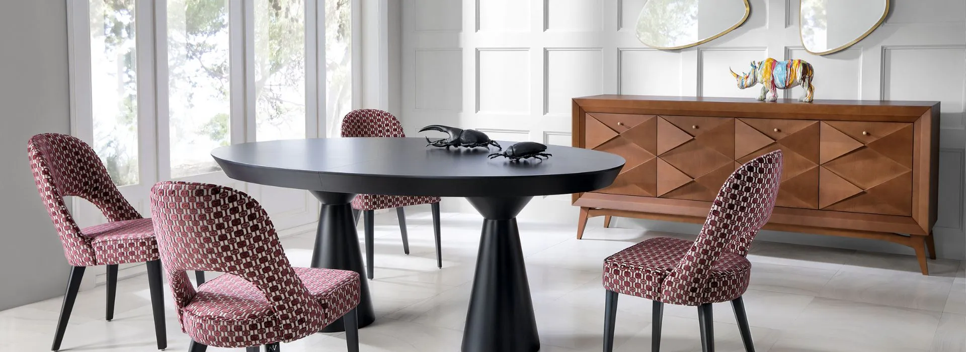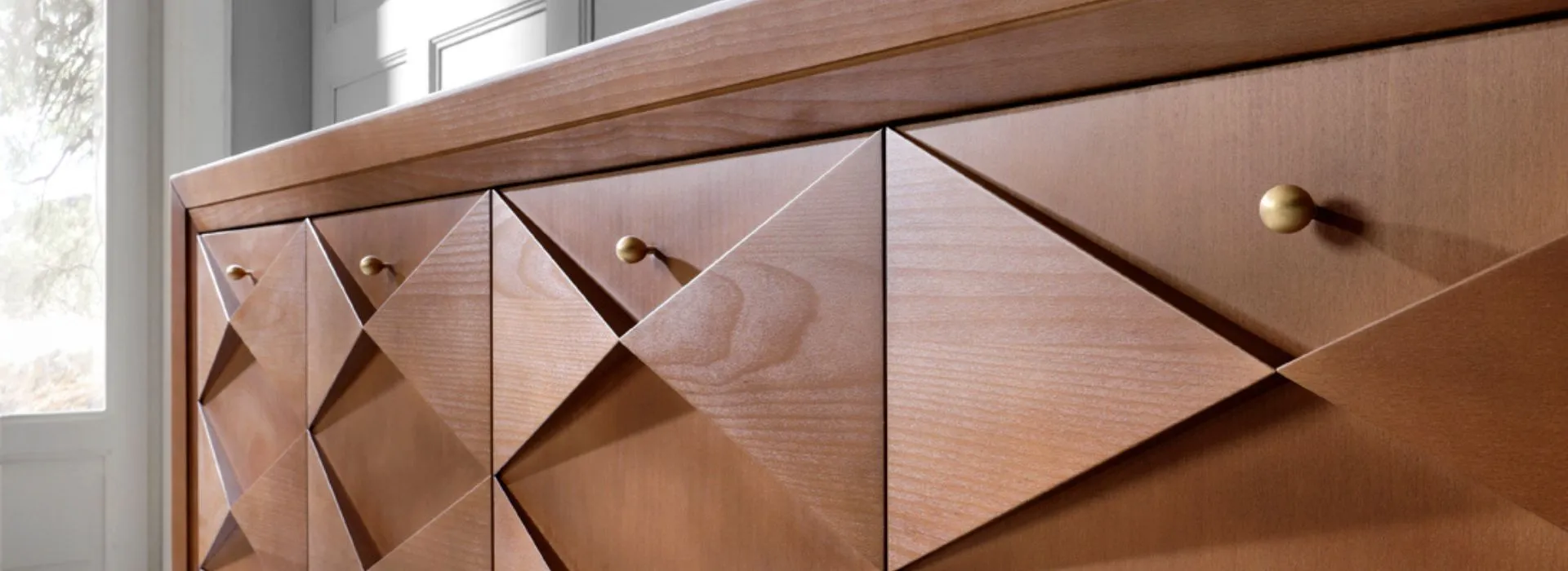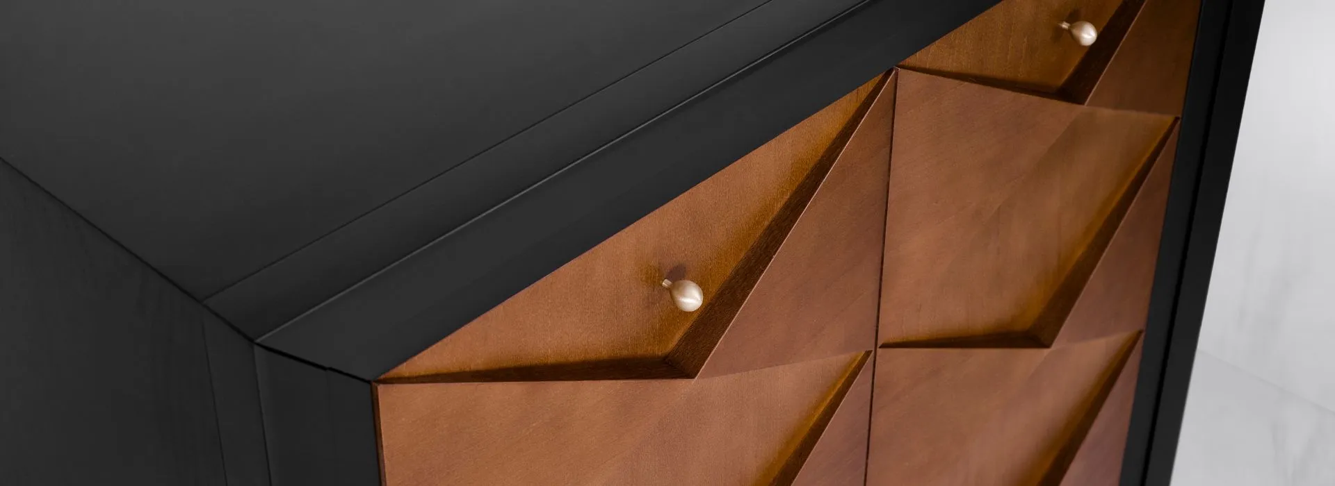 Spojrzenie w nieodległą przeszłość, i to spojrzenie pełne aprobaty. Kolekcja Flo jest przypomnieniem ducha mebli z lat 1960., rozwiniętych we współczesną, odważną dekoracyjność. Masywne korpusy na skośnie odstawionych nóżkach są ramą dla frontów, frezowanych w płaskie i wypukłe romby; ich regularny, kopertowy wzór to popis precyzji, rozkwitającej w bogactwo światłocienia. Kolekcja Flo to wyraziste, kubiczne komody. Duża i wysoka, 2-drzwiowa, z kwadratowym korpusem wypełnionym szufladami. Niższe, z korpusami w układzie poziomym, 2-, 3- i 4- drzwiowe, z wewnętrznymi szufladami. A także niskie komody RTV z dwiema szufladami i otwartą, centralną niszą. Komody Flo mogą być wybarwione jednolicie lub też dwubarwnie (nogi/korpus + fronty). Szczególnie polecamy wybarwienia matowe, które podkreślają naturalny rysunek drewna, np. koniak, orzech włoski czy czarna perła.