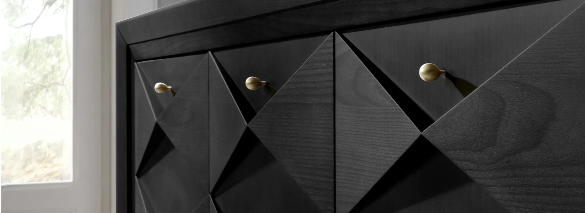 Spojrzenie w nieodległą przeszłość, i to spojrzenie pełne aprobaty. Kolekcja Flo jest przypomnieniem ducha mebli z lat 1960., rozwiniętych we współczesną, odważną dekoracyjność. Masywne korpusy na skośnie odstawionych nóżkach są ramą dla frontów, frezowanych w płaskie i wypukłe romby; ich regularny, kopertowy wzór to popis precyzji, rozkwitającej w bogactwo światłocienia....