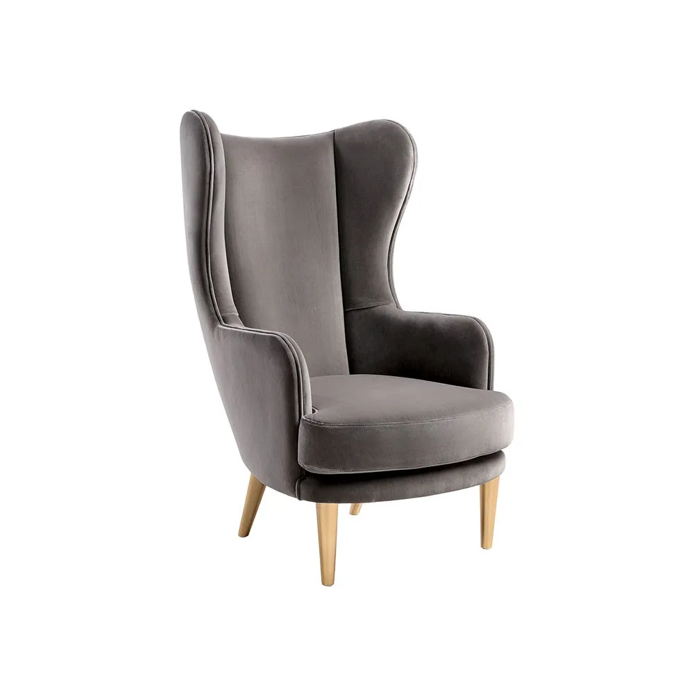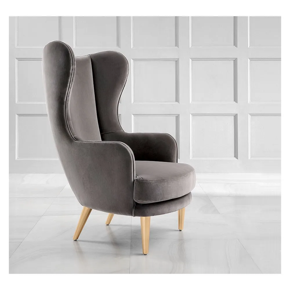 Designerska forma zaokrąglonych kształtów nawiązuje do ikony stylu; ten fotel docenią miłośnicy trendów jak i klasyki. Doskonale sprawdzi się zarówno w klasycznym wnętrzu, jak i we współczesnych aranżacjach. Na uwagę zasługuje wysokie, dobrze wyprofilowane oparcie, które zapewni odpoczynek po intensywnym dniu. Fotel wykonany w wysokiej jakości tkanie o neutralnym odcieniu szarości; indywidualności i odrobinę ekstrawagancji nadają mu stożkowe nóżki w kolorze złota, ręcznie wyklejane złotym szlagmetalem – czasochłonną i prezycyjną techniką zdobienia; stelaż wykonany z litego drewna bukowego