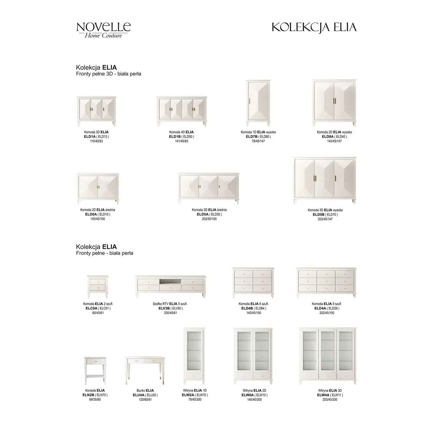 Elia to klasyczny mebel we współczesnym kostiumie, adresowany do miłośników wnętrz, oczekujących ponadczasowej elegancji. Elia jest niezwykle pojemna, pomieści wszystkie niezbędne drobiazgi. Przeszklone fronty sprawiają, że ten sporych rozmiarów mebel nie przytłacza wnętrza, przeszklenie pozwala też na piękne wyeksponowanie waszych ulubionych przedmiotów w salonie czy wielofunkcyjnym pokoju dziennym. Wybarwienie w kolorze matowej bieli daje duże możliwości aranżacyjne, a autorskie uchwyty sygnowane logo NV sprawiają, że Elia będzie zdecydowaną ozdobą każdej aranżacji – od klasycznych po te zupełnie współczesne.